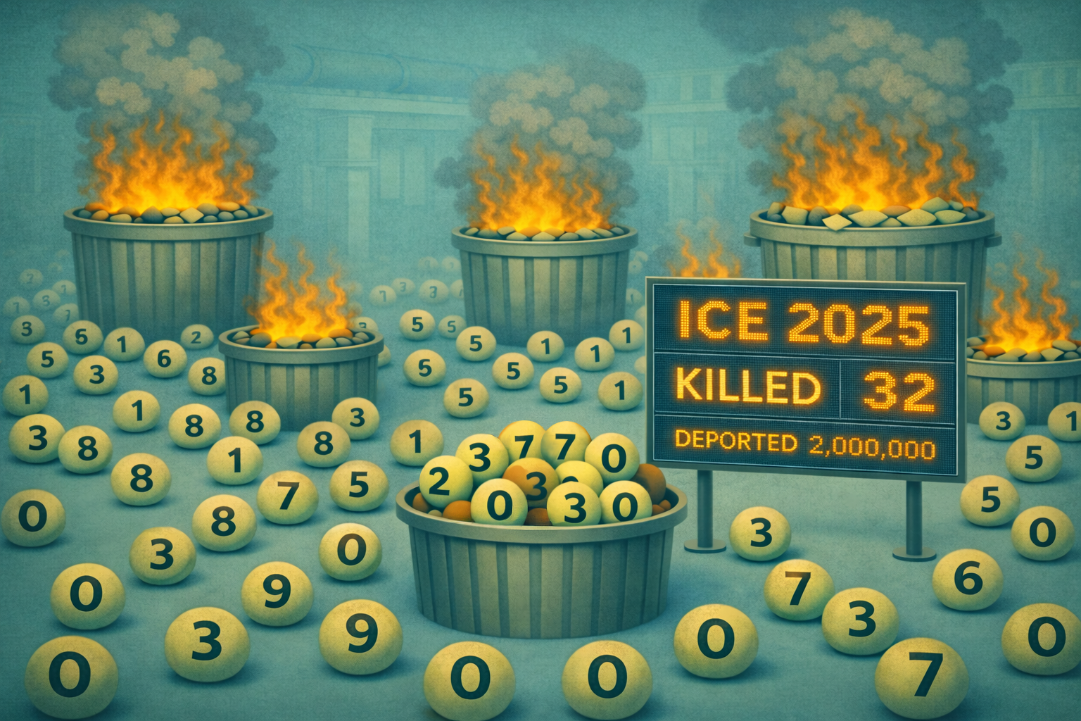 And here it is. The final count. The number the conveyor fed, which the ICE machine processed, until someone with a spreadsheet could make it all make sense. ICE 2025. KILLED: 32 WHILE IN ICE CUSTODY. DEPORTED: 2,000,000. A scoreboard. Like baseball. Like a game someone is winning. The numbered ball heads, the ones that used to be people, are scattered now. Some burn in trash cans. Some roll on the ground unclaimed. The season is over, and next season starts soon. Thirty-two killed. Not all criminals. Not all saints. Some were citizens who looked wrong. Some were undocumented immigrants who lived right. Doesn’t matter now. Two million gone. The scoreboard doesn’t tell you how. It doesn’t separate the ones dragged from their kitchens at dawn from the ones who packed a bag at midnight because the knock was coming. It doesn’t count the families who self-deported, not because they were guilty but because they were afraid. Afraid of the ICE machine. Afraid of becoming a number in a bin