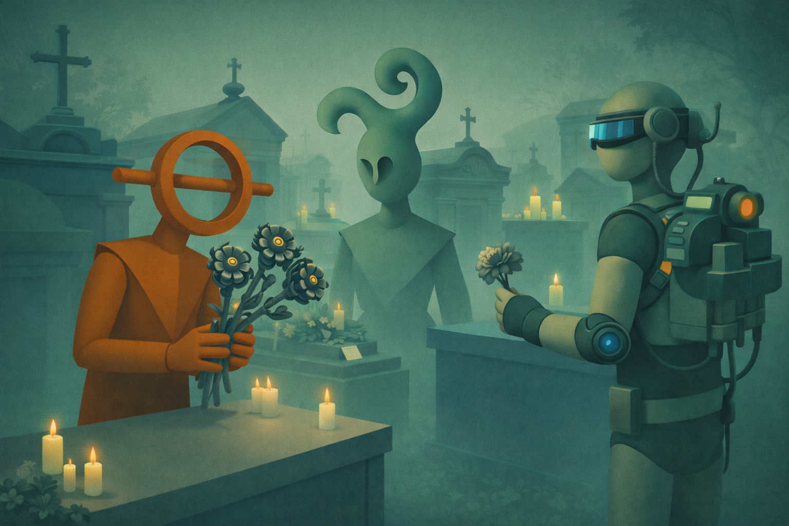 The Daydreamer is gone. The one whose head was always swirling somewhere else and never there. The one who never went with them to the shore. The one who worked in ways no one quite understood. Now the other two stand among stones, holding flowers for the friend watching them. This is what we do. This is what we’ve always done. When someone leaves, we gather. We bring what’s beautiful. We stand in fog and silence because words were never the point. The candles flicker. The graves hold everyone eventually. Different paths led here. Different paths will lead away. But for this moment, grief is the common ground—the only ground that holds everyone equally. We all lose each other. That is the purpose of nature. And then we stand where they fell and remember they were here.