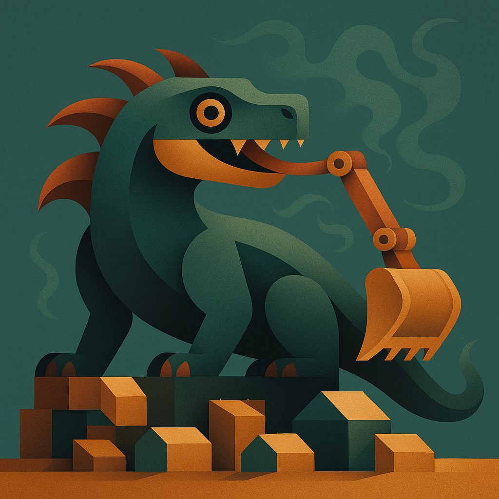 Demolition artist who builds by taking things apart. With an excavator arm for a tongue, teeth that can bite through concrete, and a bucket scoop that moves with reptilian precision, he’s the heavy equipment specialist who clears sites and creates foundations. His excavator tongue articulates in every direction, scoops rubble into perfect cubes (because even his destruction is organized), and operates with the patient efficiency of a predator who knows the work will get done. He breathes faint smoke while working (exhaust from his internal engine) and leaves behind perfectly cleared spaces ready for whatever comes next. He practices his bucket control on imaginary projects and has strong opinions about proper excavation technique.