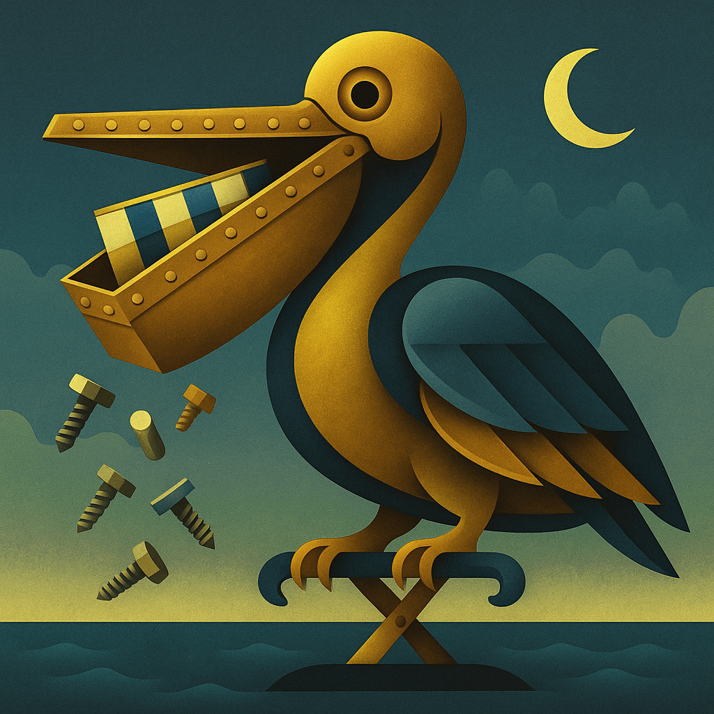 Mobile supply depot everyone depends on but nobody remembers to thank. With a hinged tool chest for a beak that holds every fastener, fitting, and hardware piece you could possibly need. He is the logistics specialist who keeps every project moving. His chest-beak opens to reveal perfectly organized compartments—screws sorted by thread count, bolts by diameter, washers by size. Pelibix flies over job sites dropping fasteners like a mechanical stork, hovers steady while workers grab supplies mid-flight, and never runs out of inventory (his storage capacity defies physics). He spends his free time alphabetizing fasteners, updating his mental catalogue, and gliding over the calm teal sea contemplating supply chain efficiency.